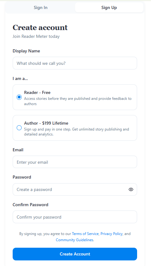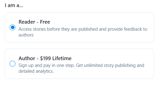 - Decide if you want to start as a reader (free) or as an author ($199 upgrade).