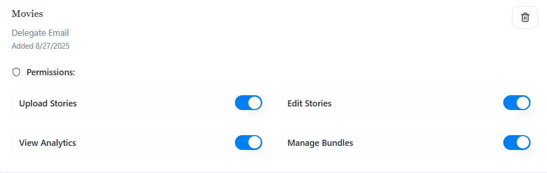 Select permissions (upload stories, view analytics, manage bundles, etc.).